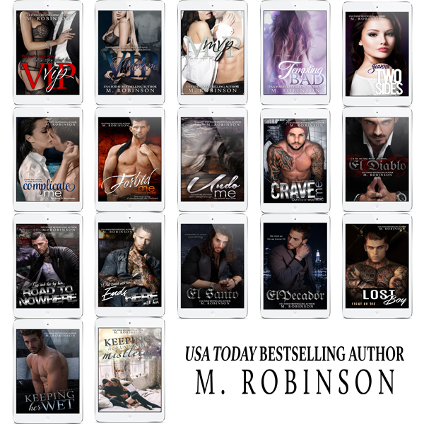 USA Today Bestselling Author of Keeping her Under The Mistletoe, Lost Boy, El Santo, El Pecador, Ends Here, Keeping Her Wet, Road to Nowhere, El Diablo, The Good Ol’ Boys Standalone Series, The VIP Trilogy, Tempting Bad, and Two Sides.M. Robinson loves her readers more than anything! They have given her the title of the ‘Queen of Angst.’ She loves to connect with her following through all her social media platforms and also through email! Please keep in touch in her reader group VIP on Facebook, if she’s not in there than she is on Instagram.